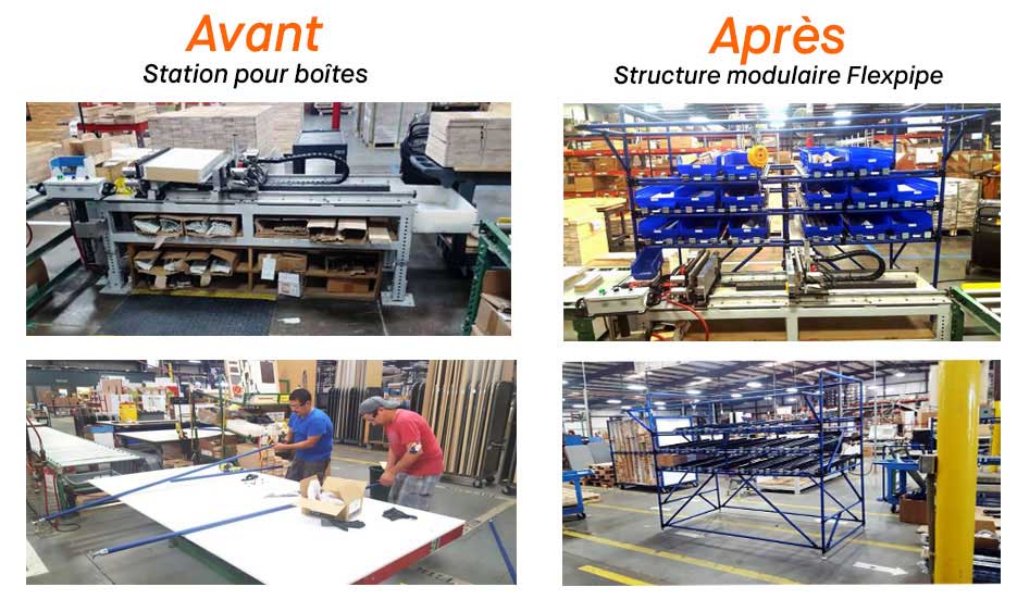 Dans l’exemple ci-dessus, un grand fabricant d’armoires qui avait adopté la production Lean a décidé qu’il devait améliorer ses espaces de travail en supprimant ses postes soudés, lourds et difficiles à utiliser. En utilisant la solution modulaire et évolutive de Flexpipe, ce fabricant a créé un espace beaucoup plus sécuritaire et plus ergonomique qui a contribué à réduire le va-et-vient, les chutes et les faux pas.
