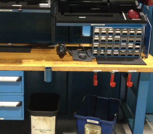 Whereas everything was “dumped” on the older workstations and easily misplaced, the new Flexpipe workstations had clearly labeled locations for all tools and consumables. The Flexpipe structure was customized to fit a specific shadow board size so that all parts were neatly placed at the end of a given shift.