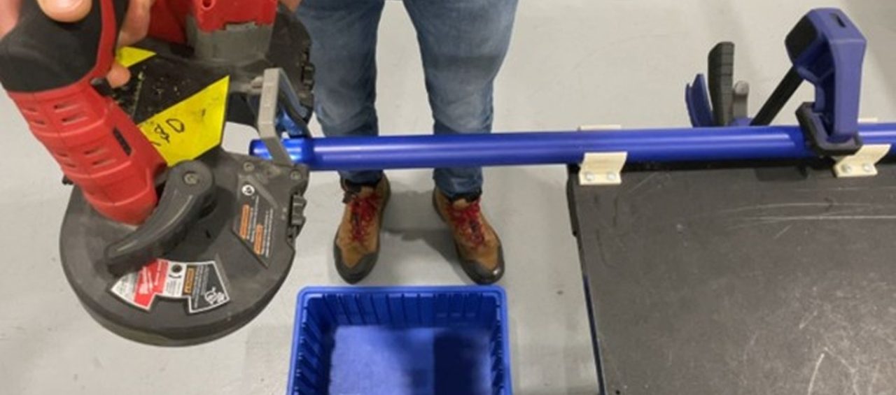 Industrial metal cutting bandsaw cutting multiple Flexpipe tubes on a yellow and blue modular workstation.