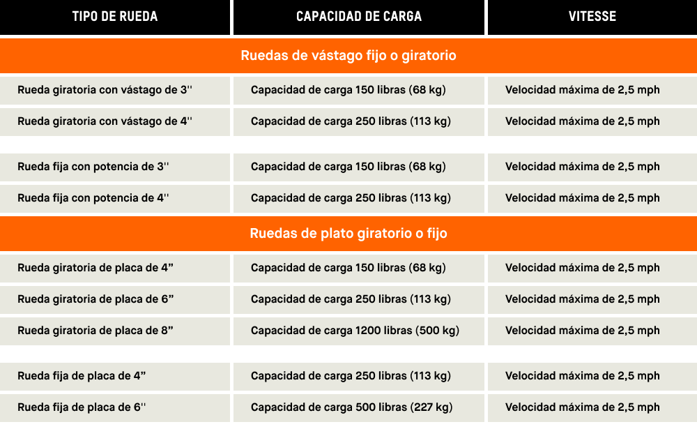 • Capacidad de Carga de la Rueda: Cada rueda está diseñada para soportar una cantidad específica de peso. Entender este peso es crucial, ya que todas las estructuras de manejo de materiales están diseñadas en función de un peso máximo soportable.