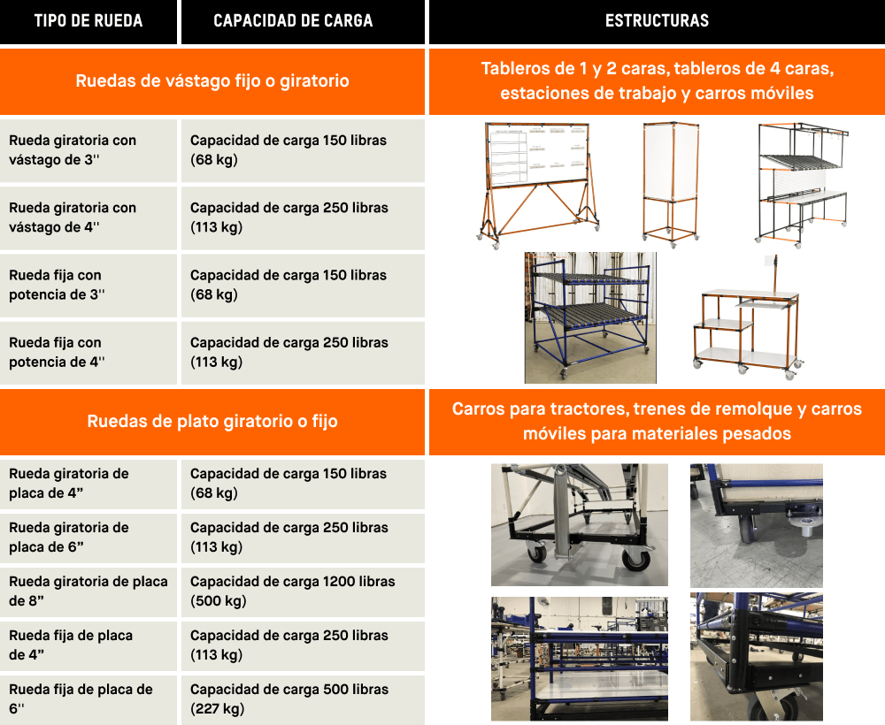 Cada rueda tiene un peso específico que puede soportar. Este peso, o capacidad de carga, siempre se indica en cada tipo de rueda. Comprender el peso que cada rueda puede soportar es crucial para diseñar y ensamblar cualquier estructura de manejo de materiales con tubos de acero y uniones.